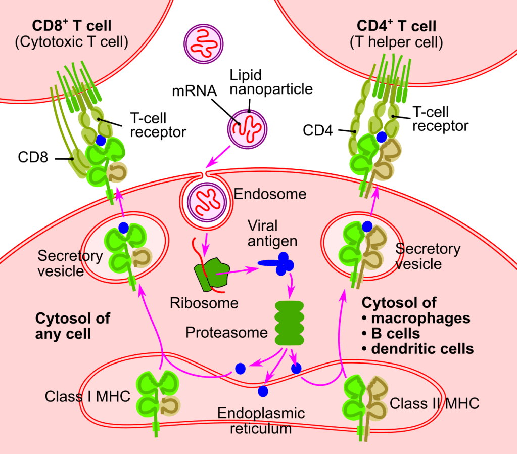 Once the mRNA is used to create spike protein, it is destroyed by our cell9. The spike protein will make its way to the surface of the cell and be presented to the rest of our body until an immune cell bumps into it. Here are two possible immune cell responses leading to immunity: