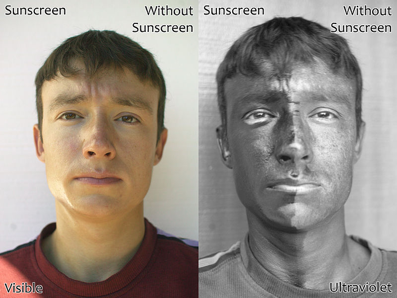 Let’s return to the phenomenon of sunscreen when viewed through a UV camera. Most sunscreen will appear as a black paste as seen in Figure 4. This is because UV rays are “absorbed” and do not reflect back or through the sunscreen. Here is a great video which covers this topic and more. Think about how the color black “attracts” more heat. This is because the visible light spectrum is absorbed by the structure of the pigments making the color black, and the energy of the light is converted into heat. Now think of sunscreen as more or less the same thing, but for UV light and not visible light.